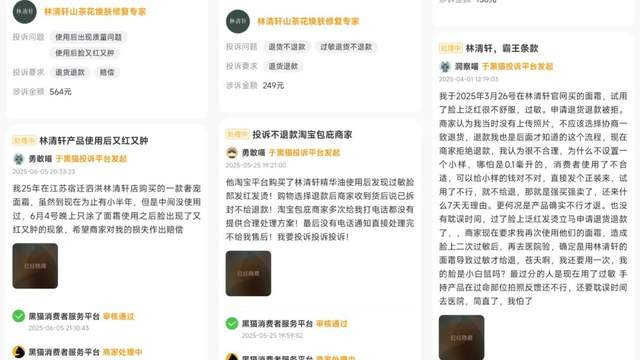 在黑猫投诉平台上,林清轩当今接洽投诉已有上百条,主要联接在过敏反应、退款难等问题。有糜掷者反应,在江苏泗洪门店购买的奢宠面霜,半年未使用,初度使用便出现脸部红肿;也有效户反馈,在官网购买面霜后出现泛红过敏,央求退货退款却遭拒。