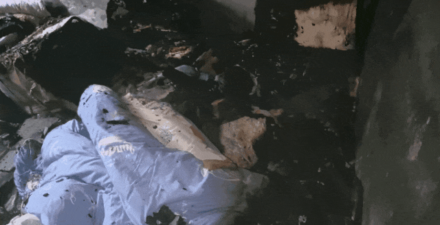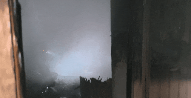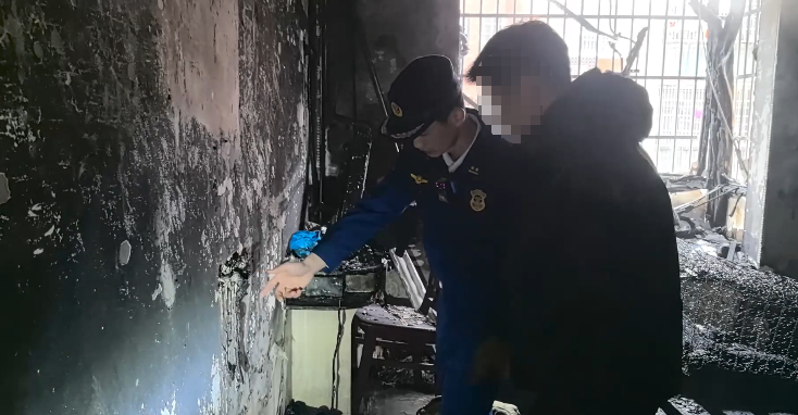 户主给消防员指出事发前头灯充电器的位置。图源:九江消防
